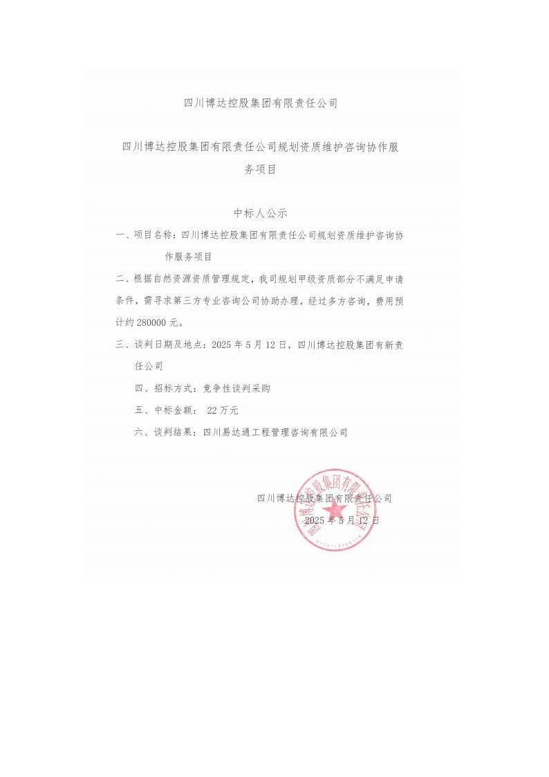 四川博达控股集团有限责任公司规划资质维护咨询协作服务项目中标公告