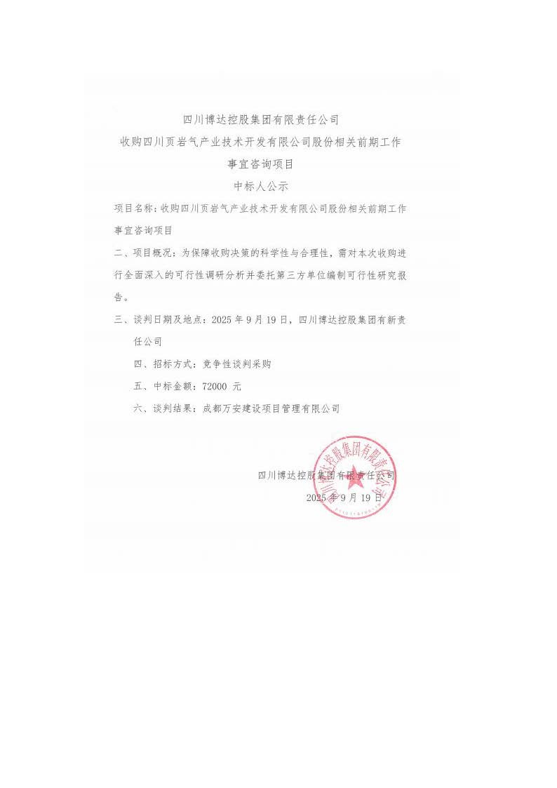 收购四川页岩气产业技术开发有限公司股份相关前期工作事宜咨询项目中标公告