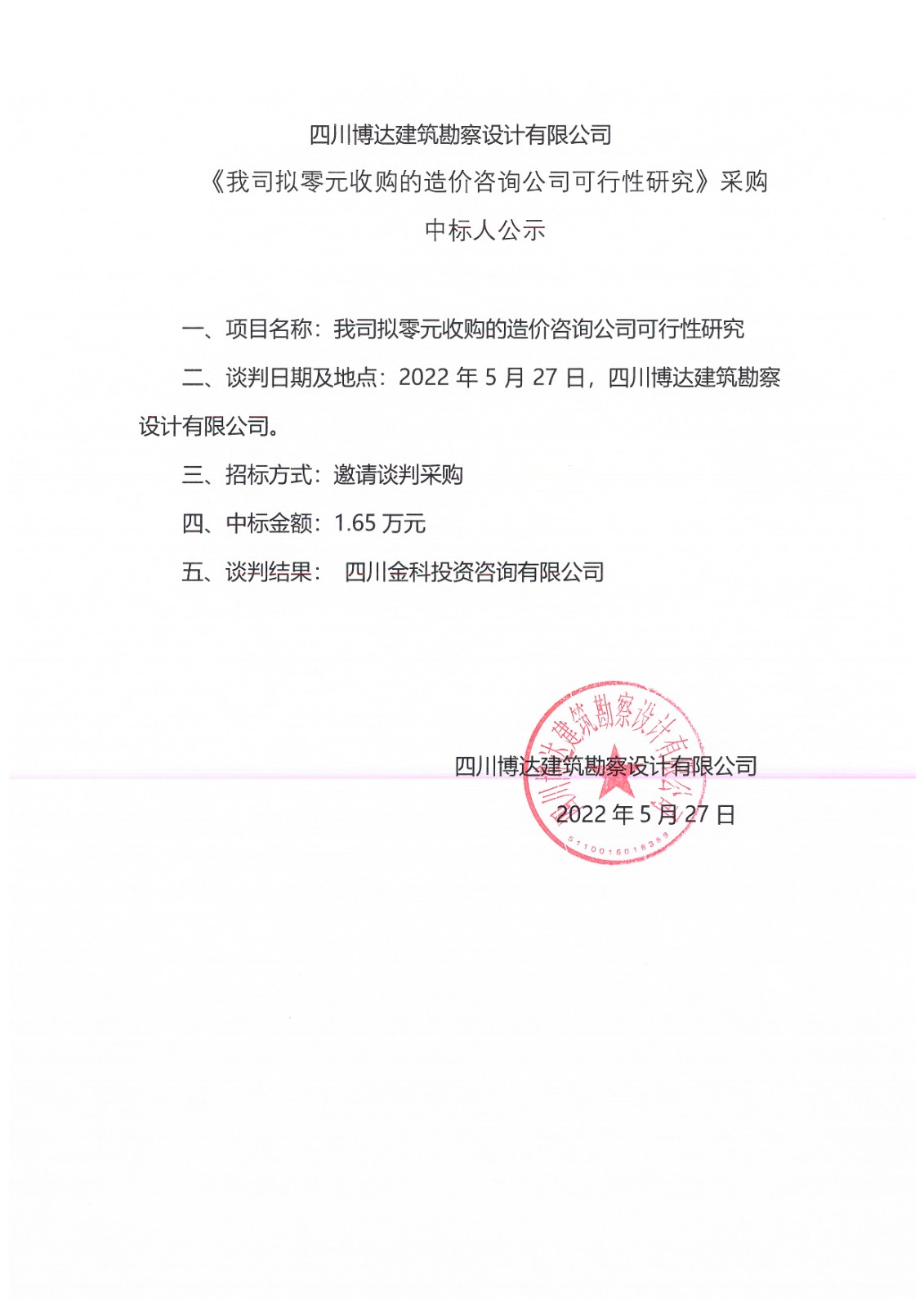 四川博达建筑勘察设计有限公司《我司拟零元收购的造价咨询公司可行性研究》采购中标人公示